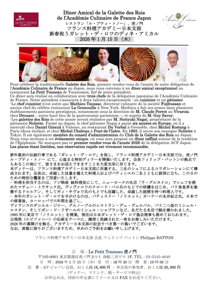 -Les galettes des Rois de cette année seront réalisées par M. Noriyuki Nagai, propriétaire de la pâtisserie Noliette. Formé au Japon, le chef pâtissier Nagai a passé six années en Europe, où il a exerculé chez Daniel Giraud à Valence, au restaurant Du Verbal à Grenoble, chez Michel Rostang à Paris (deux étoiles), et chez Michel Chabran à Pont-de-l’Isère. En 1993, il ouvre son enseigne Noliette à Tokyo. Il est également membre du conseil d’administration du Club de la Galette des Rois au Japon. Nous vous invitons à cet événement unique, où vous sera proposé un dîner raffiné autour de la tradition de l’Épiphanie. Ne manquez pas ce premier rendez-vous de l’année 2026 de la délégation ACF Japon. Les places étant limitées, une réservation rapide est vivement recommandée.